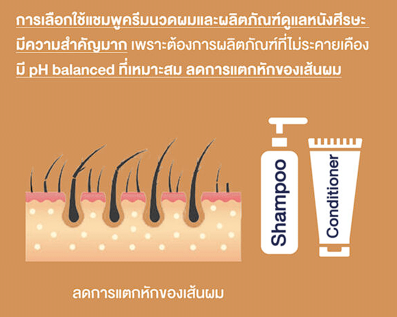 • สระผมด้วยแชมพูที่มีค่า pH ใกล้เคียงกับค่า pH บนหนังศีรษะธรรมชาติ โดยค่า pH ที่เหมาะสมของแชมพูควรอยู่ที่ประมาณ 5.5-6.5