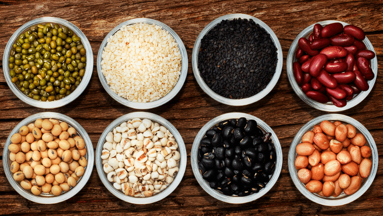 ถั่วเป็นแหล่งโปรตีนที่ดีเช่นกัน ถั่วบางชนิด เช่น ถั่วเหลืองและถั่วเลนทิล เป็นแหล่งของไอรอน ซึ่งเป็นแร่ธาตุที่จำเป็นต่อการสร้างเซลล์เม็ดสีเมลานิน ซึ่งเป็นเม็ดสีที่ช่วยให้ผมมีสีเข้มและสุขภาพดี